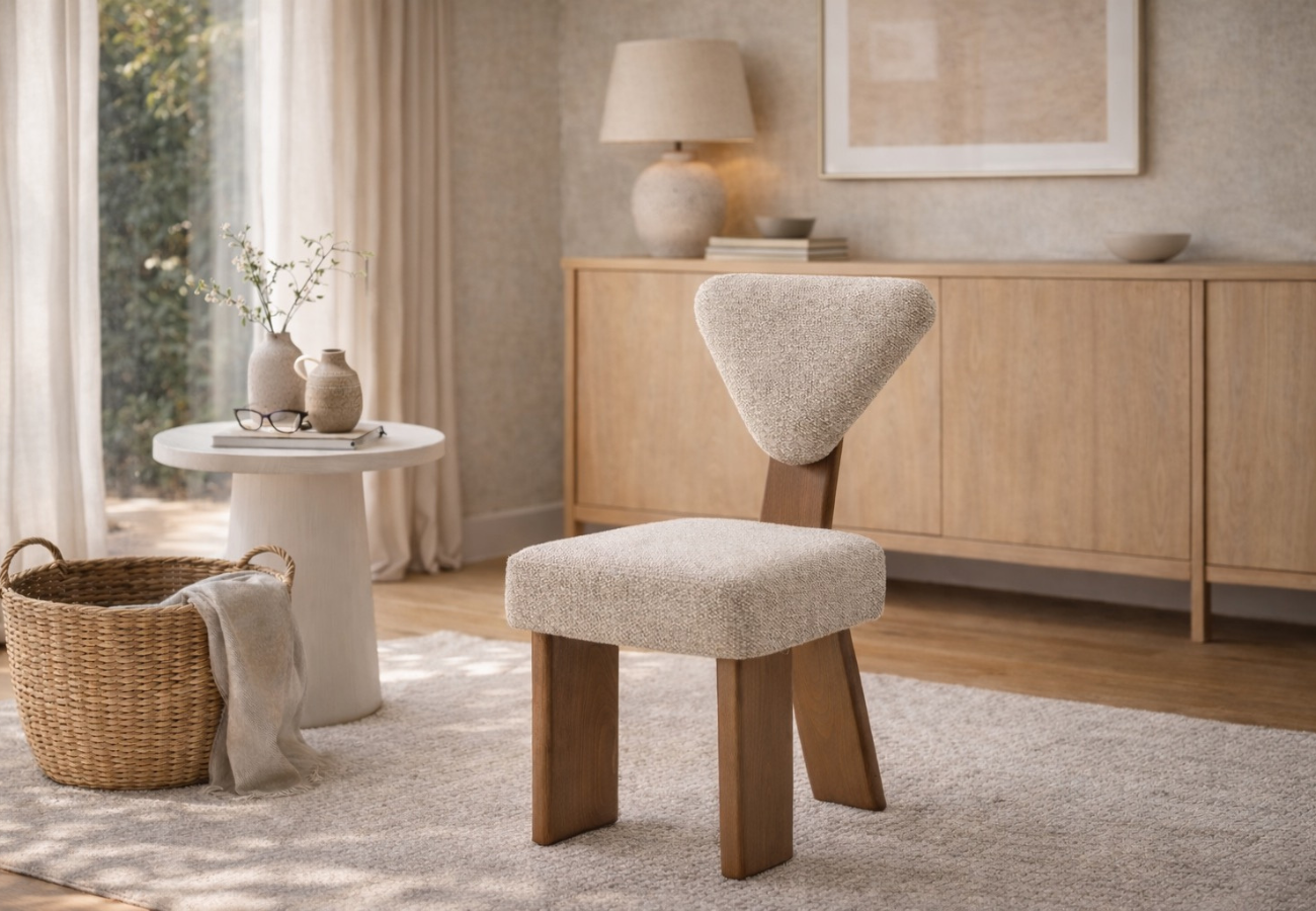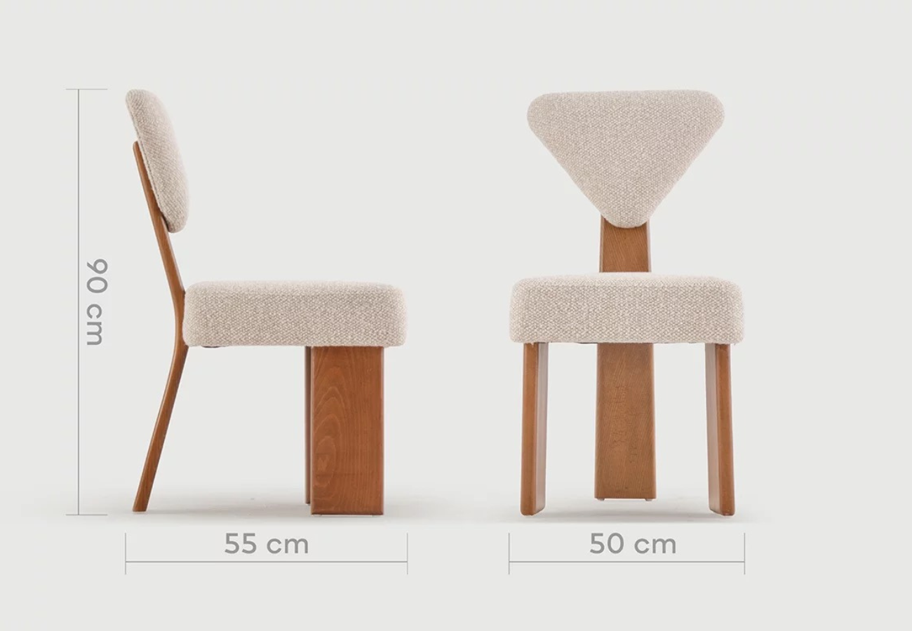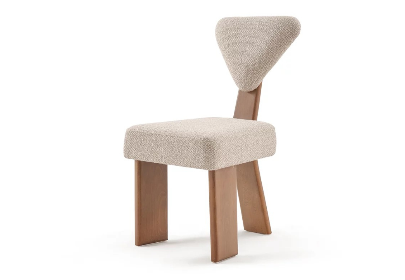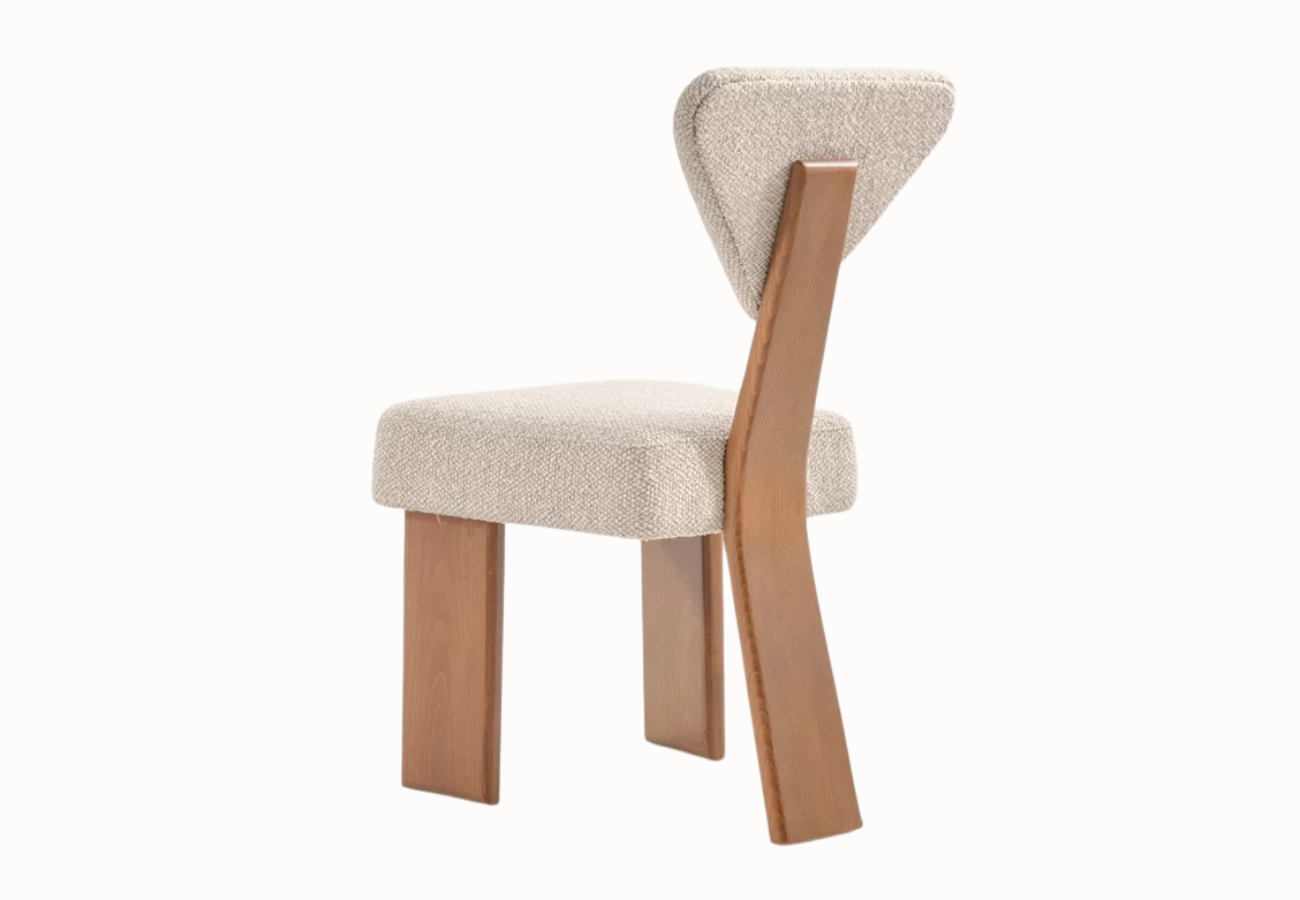 Cette chaise de salle à manger se distingue par une silhouette sculpturale et audacieuse, combinant l’authenticité du bois avec la douceur d’un tissu texturé premium. Son dossier triangulaire exclusif et son assise généreuse reposent sur une structure robuste aux pieds géométriques, offrant un contraste visuel captivant qui transforme chaque repas en une expérience de design.