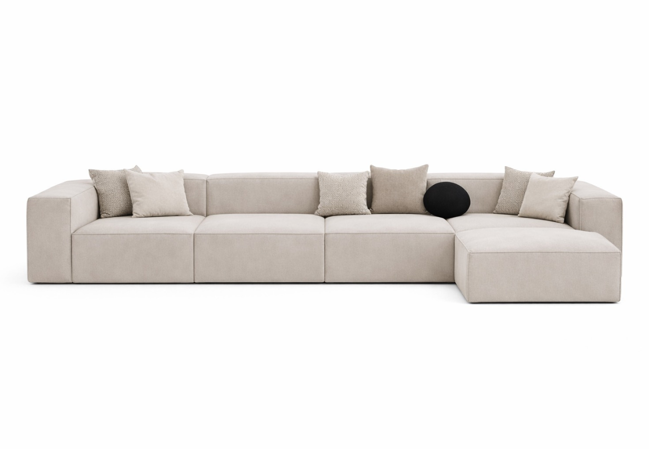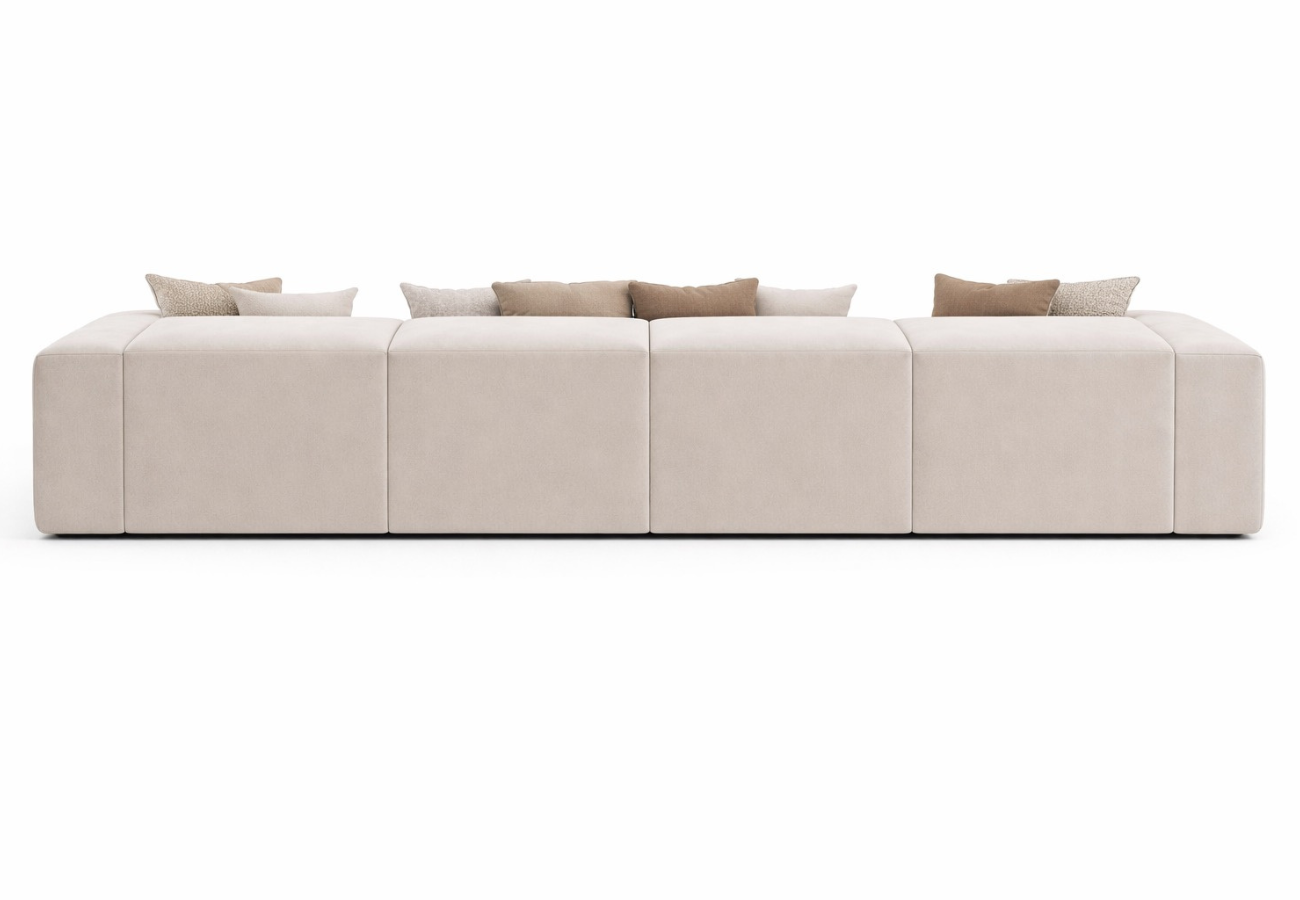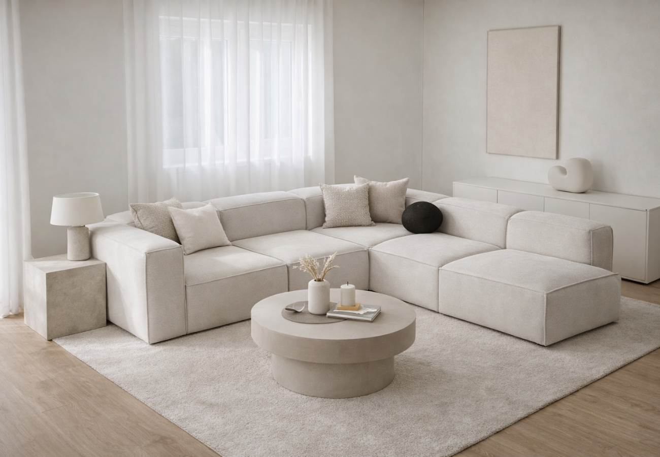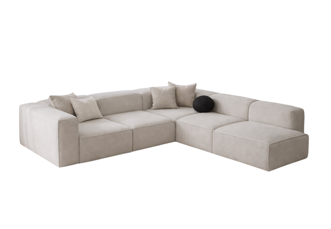 Este sofá modular encarna la esencia del diseño minimalista contemporáneo. Sus líneas puras y tonos neutros crean una presencia serena y sofisticada. El tapizado suave y uniforme aporta una sensación de calma absoluta, convirtiéndo en una pieza central elegante y atemporal para interiores refinados.