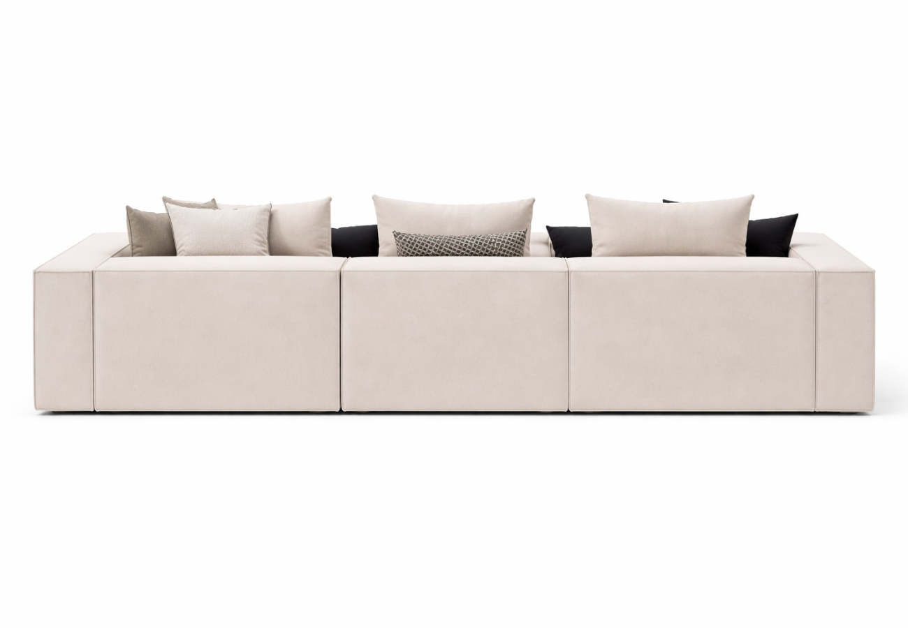 Este sofá modular en forma de L destaca por su diseño limpio y bien definido, incluso en su vista trasera, con líneas precisas y armoniosas. Tapizado en un tejido de alta calidad, ofrece una textura suave y sofisticada, junto con una comodidad envolvente. Ideal para espacios contemporáneos, combina lujo discreto, confort superior y una fabricación cuidada hasta el último detalle.