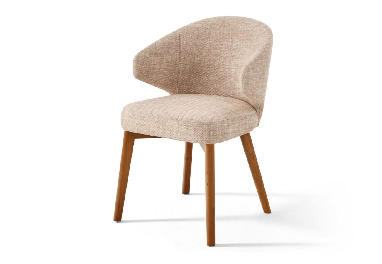 Esta silla destaca por su respaldo envolvente de líneas suaves, concebido como una carcasa protectora que aporta carácter al conjunto sin perder ligereza visual. El tapizado textil, de textura sutil, realza la pureza de la forma y transmite una sensación de confort y elegancia.