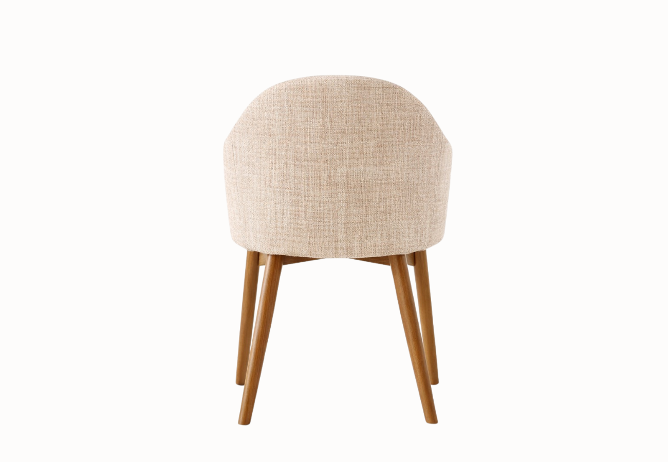 En la parte posterior, las patas de madera maciza ligeramente abiertas aportan estabilidad y un contraste cálido frente al tejido claro. Su inclinación delicada equilibra la estructura y refuerza el diseño contemporáneo de la pieza. Su armazón en madera maciza de alta gama, pensado para perdurar, asegura solidez y longevidad. El asiento equipado con espuma HR garantiza un confort duradero, manteniendo la forma y el soporte con el paso del tiempo.