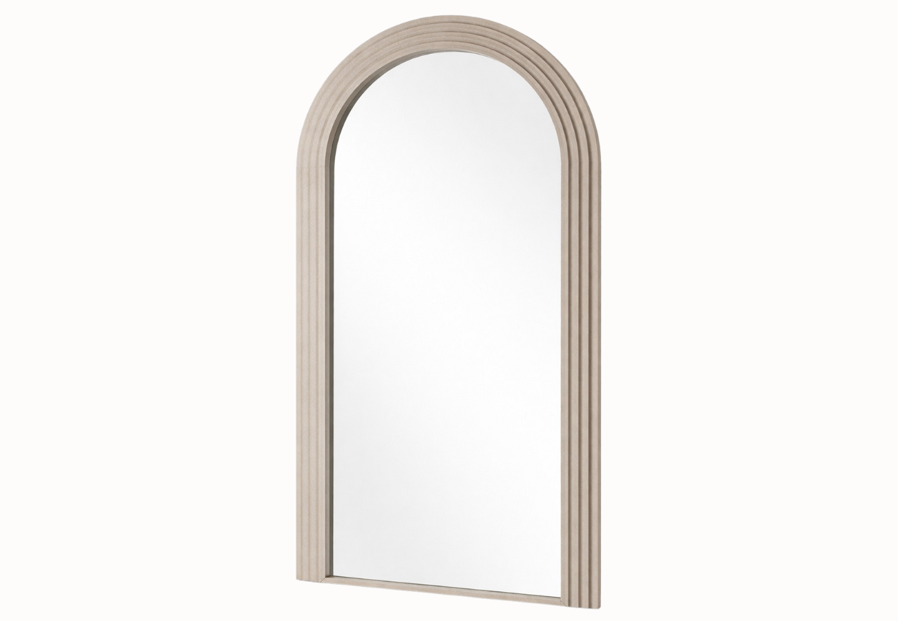 Este espejo de suelo destaca por su majestuoso marco en arco, cuyas molduras en relieve crean un efecto de profundidad impactante. Verdadera pieza maestra arquitectónica, su acabado en un tono arena texturizado aporta una calidez orgánica y un toque de lujo discreto a su interior. Sus líneas curvas, inspiradas en los pórticos clásicos, suavizan el espacio mientras maximizan la luminosidad natural. Es el espejo ideal para transformar una estancia en un santuario de estilo, combinando la pureza del diseño minimalista con una presencia escultórica definida que realza cada reflejo.