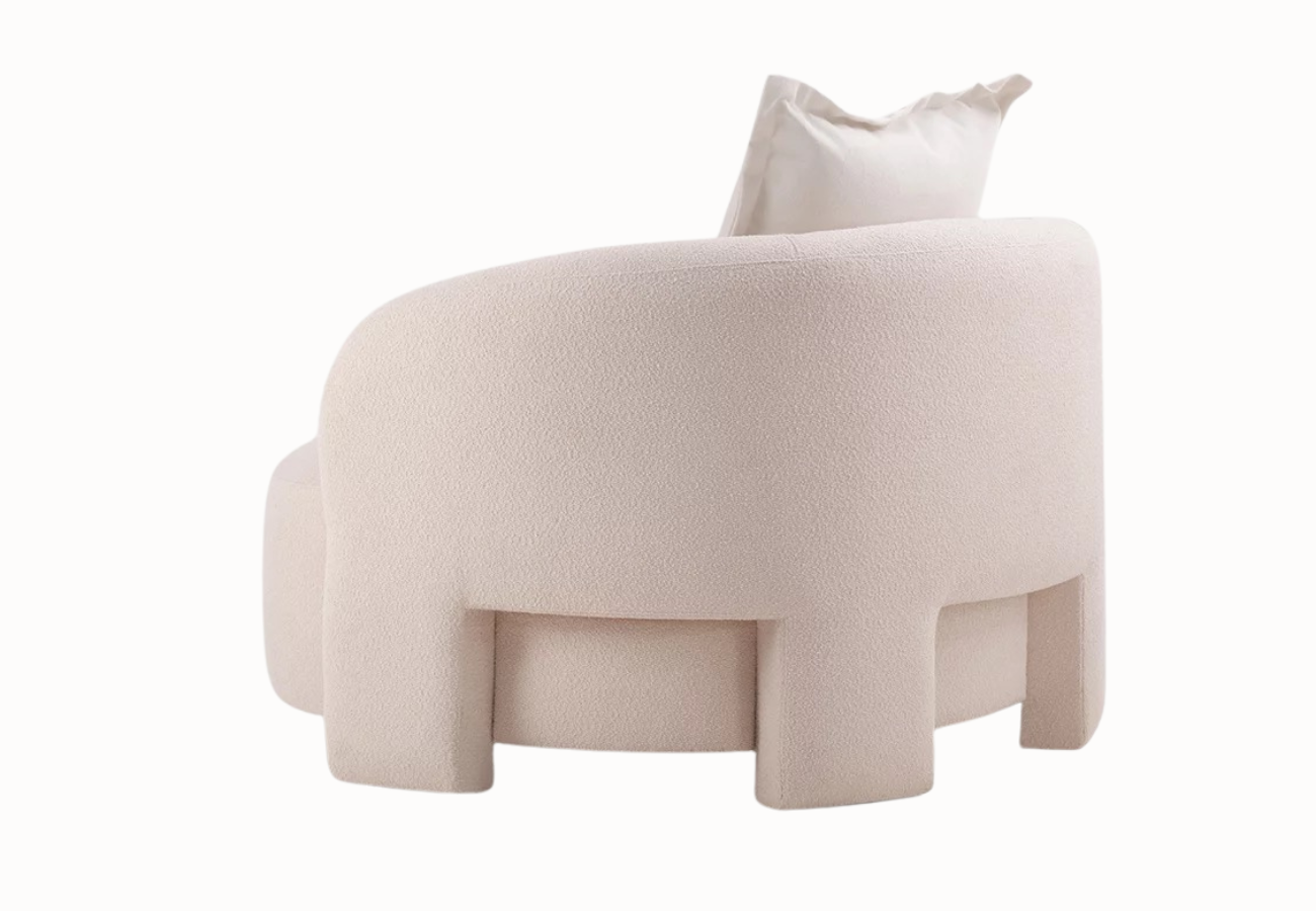 Este sillón destaca por su diseño escultórico, donde cada curva ha sido concebida para envolver el cuerpo con elegancia y naturalidad. Sus volúmenes generosos crean una sensación de refugio, invitando a un descanso profundo y relajado.